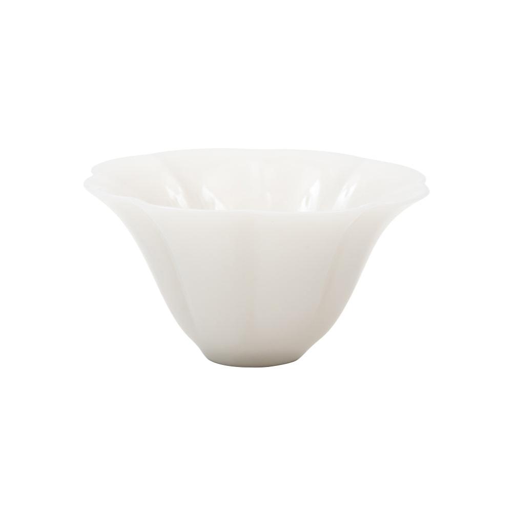 白磁でできた、花びらが咲いているように飲み口が広がった形状の茶杯です。光沢のある質感とシンプルで洗練されたデザインは、どんな茶器とも合わせやすくお茶を楽しむ時間に華やかさを加えてくれます。底の部分は安定感があり、手に持った際にもしっかりとフィットしてくれるため、手に持った際にも美しさを演出してくれます。